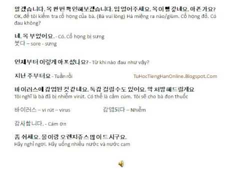 tra cổ họng của bà. (Bà vui lòng) Há miệng ra nào/giùm. Cổ họng đỏ. Có đau